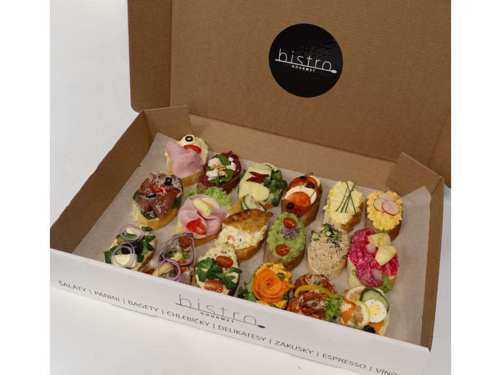 Neviete si vybrať? Ochutnajte z každého druhu. Ochutnávkový box Maxi obsahuje 18 rôznych druhov našich chlebíčkov.